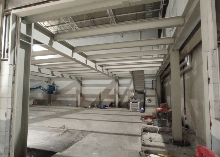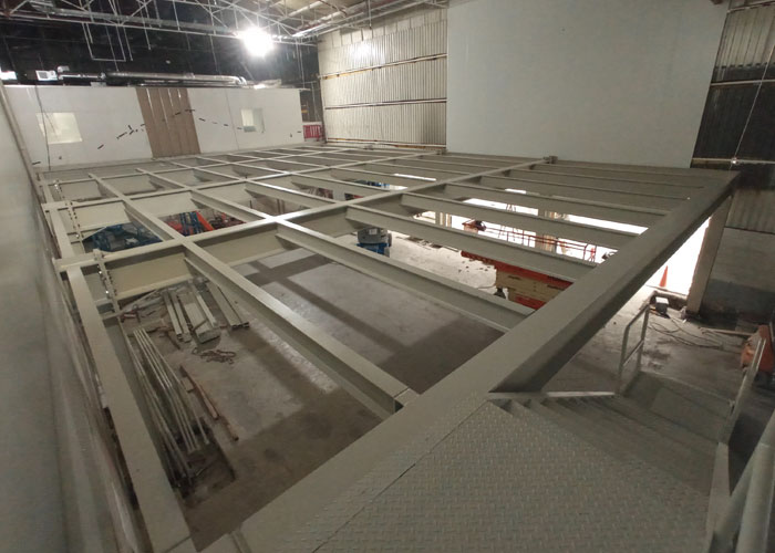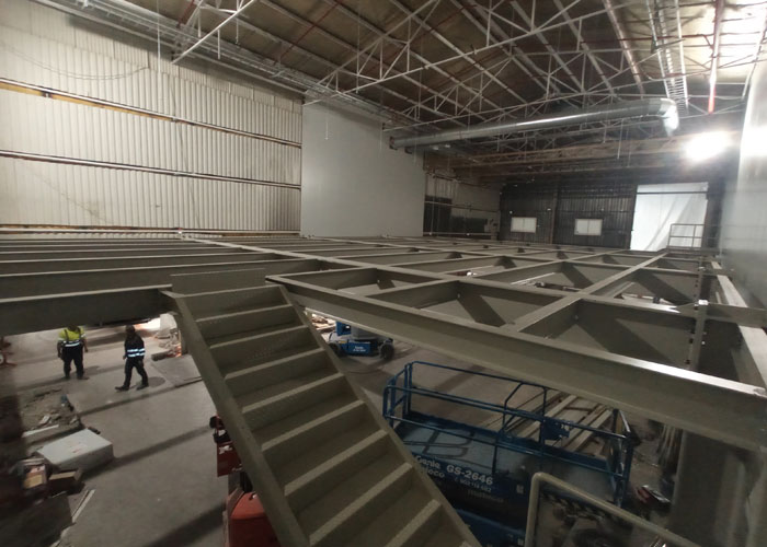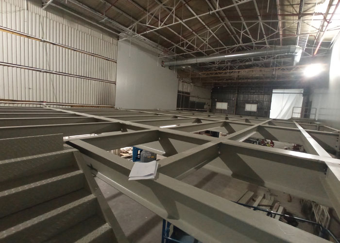 Se ha instalado una entreplanta dentro del edificio existente, con unas dimensiones de 20 m x 13,6 m y situada a 4 m de altura, a la que se accede mediante dos escaleras ejecutadas.